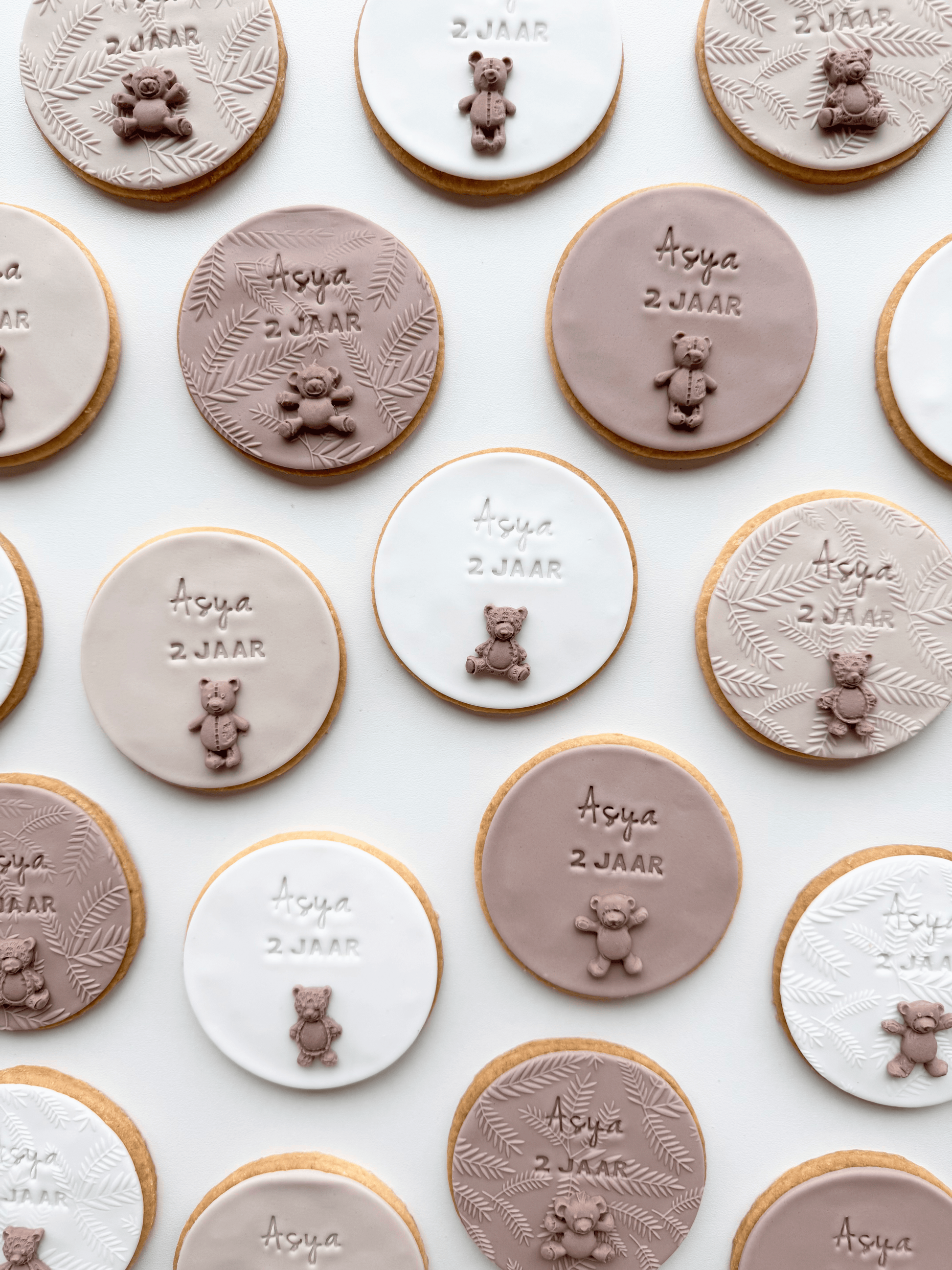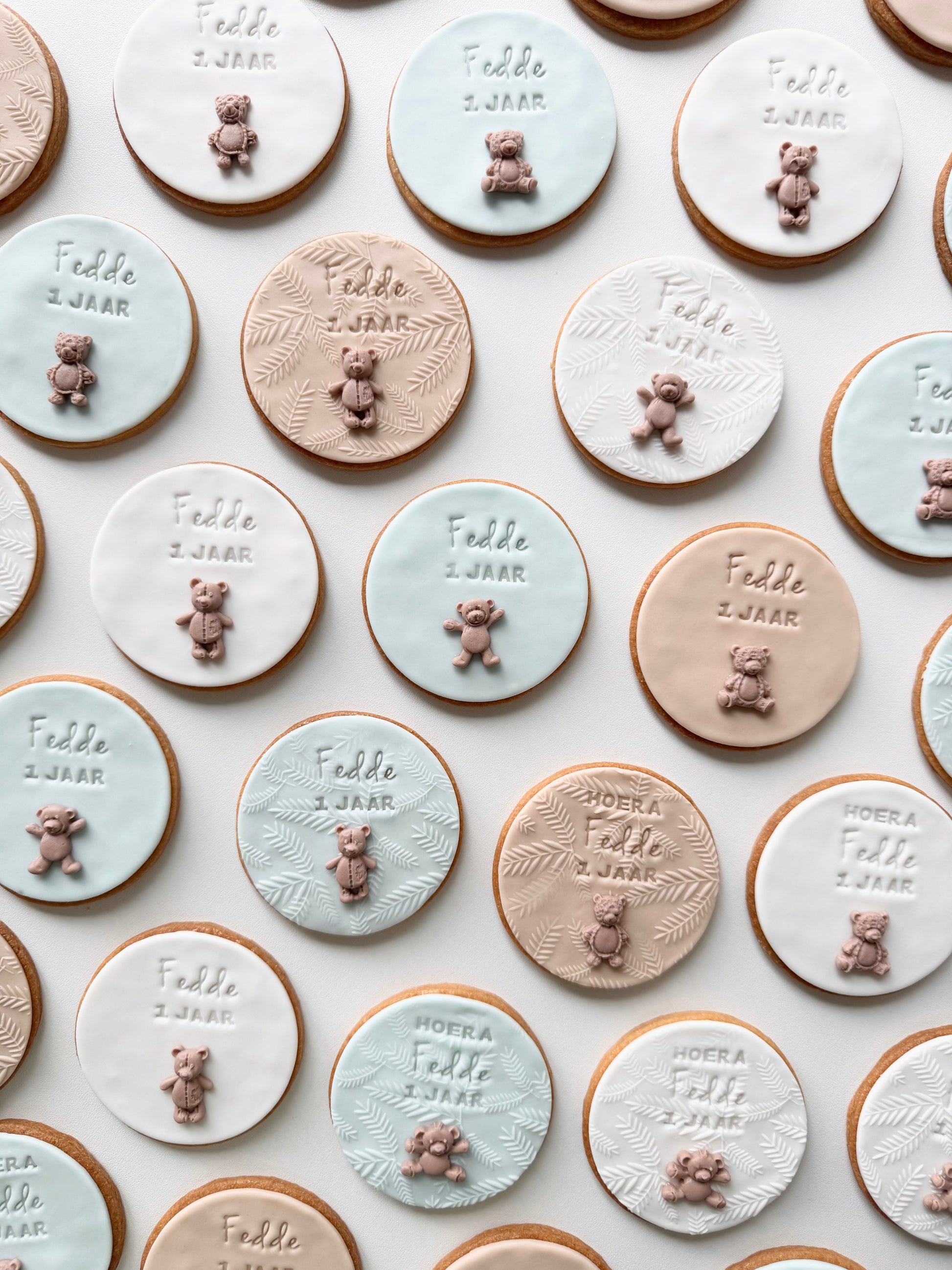 Fondantkoeken: De koeken worden individueel en luchtdicht verpakt in plastic zakjes en zijn daarom tot zo'n 4-6 weken houdbaar én lekker. Wel kan het zijn dat het fondant na een aantal weken wat verkleurt. Om de koekjes zo lang mogelijk mooi te houden, is het heel belangrijk om ze op een donkere en koele plek te bewaren totdat je ze wilt gaan consumeren.