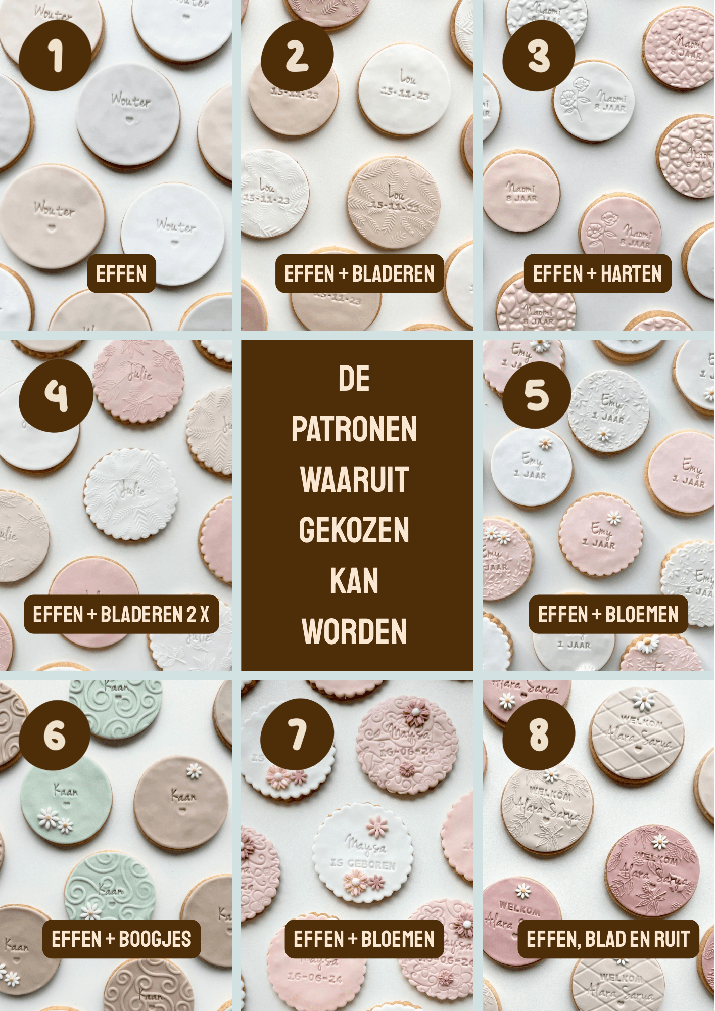 Houd er rekening mee dat bij een groter lettertype + veel tekst, er minder ruimte overblijft voor extra figuurtjes. Dit alles is uiteraard bedoeld voor de fondantkoeken en is niet van toepassing voor de Chunky Cookies