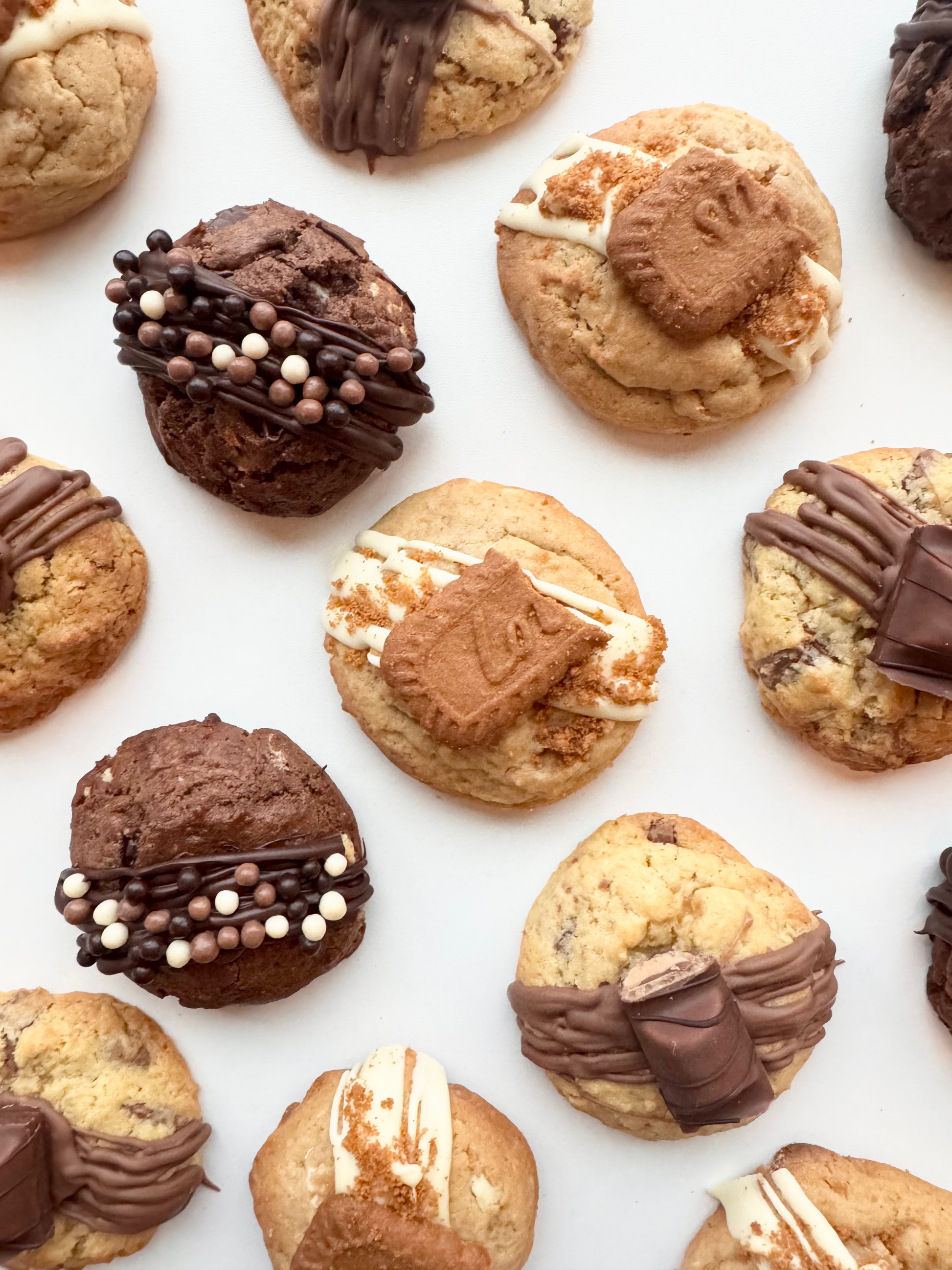 Chunky Cookies: Ingrediënten: tarwebloem, roomboter, suiker, ei, cacao, chocolade (puur, melk en wit), hazelnoten (via hazelnootpasta en/of Nutella), speculaaspasta (Speculoos), vanille, koek- en speculaaskruiden, zout, rijsmiddelen