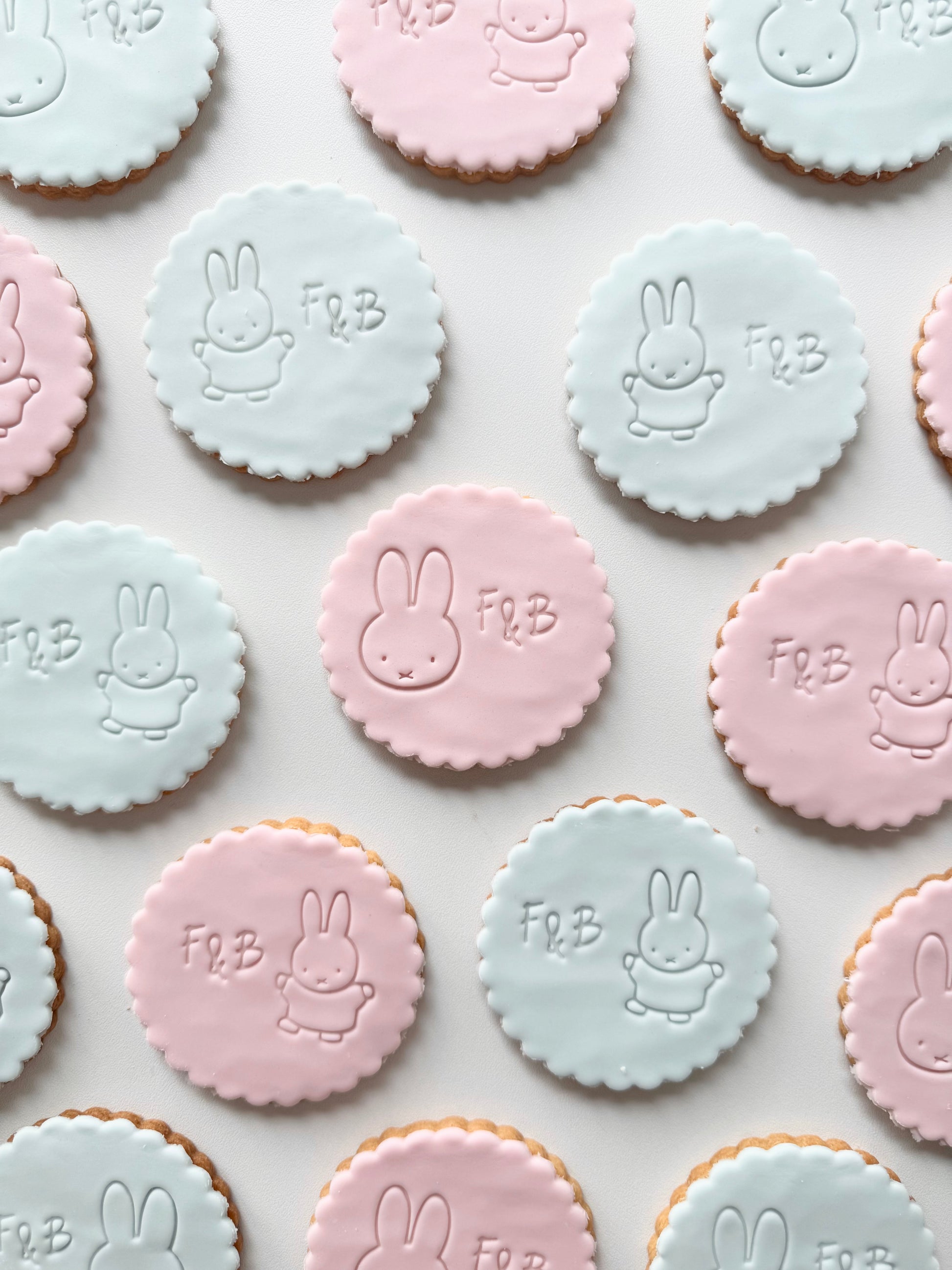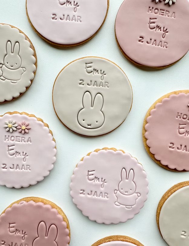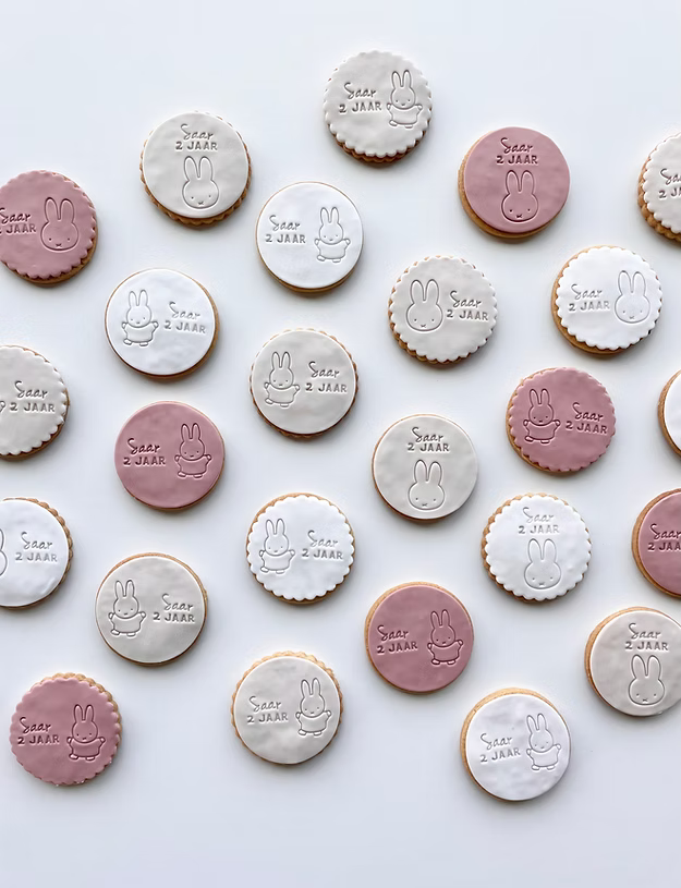 Fondantkoeken: De koeken worden individueel en luchtdicht verpakt in plastic zakjes en zijn daarom tot zo'n 4-6 weken houdbaar én lekker. Wel kan het zijn dat het fondant na een aantal weken wat verkleurt. Om de koekjes zo lang mogelijk mooi te houden, is het heel belangrijk om ze op een donkere en koele plek te bewaren totdat je ze wilt gaan consumeren.