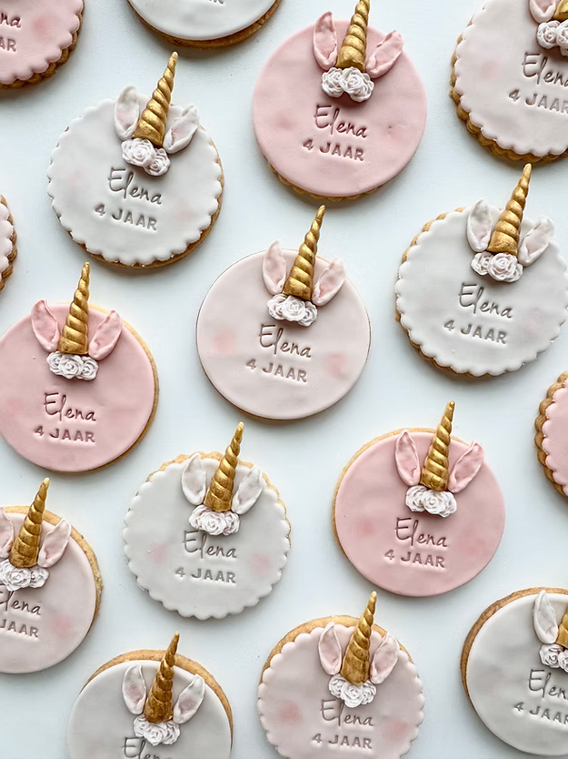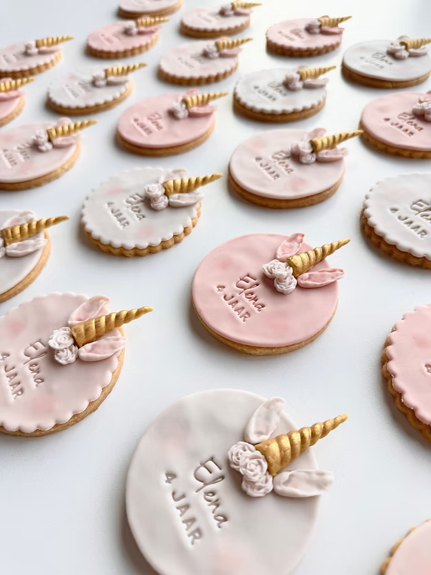 Fondantkoeken: De koeken worden individueel en luchtdicht verpakt in plastic zakjes en zijn daarom tot zo'n 4-6 weken houdbaar én lekker. Wel kan het zijn dat het fondant na een aantal weken wat verkleurt. Om de koekjes zo lang mogelijk mooi te houden, is het heel belangrijk om ze op een donkere en koele plek te bewaren totdat je ze wilt gaan consumeren.